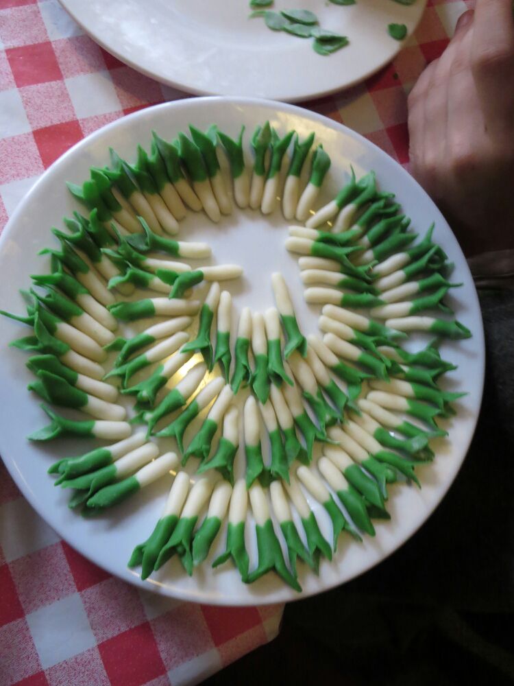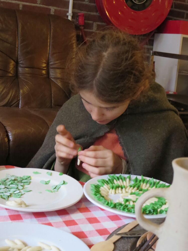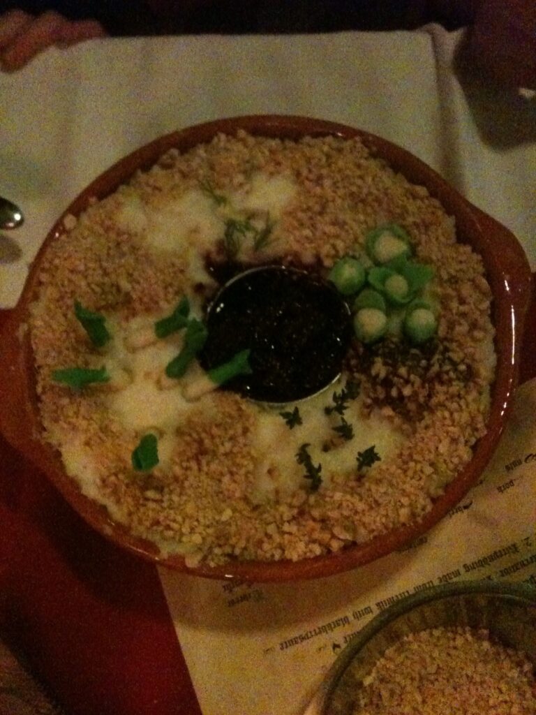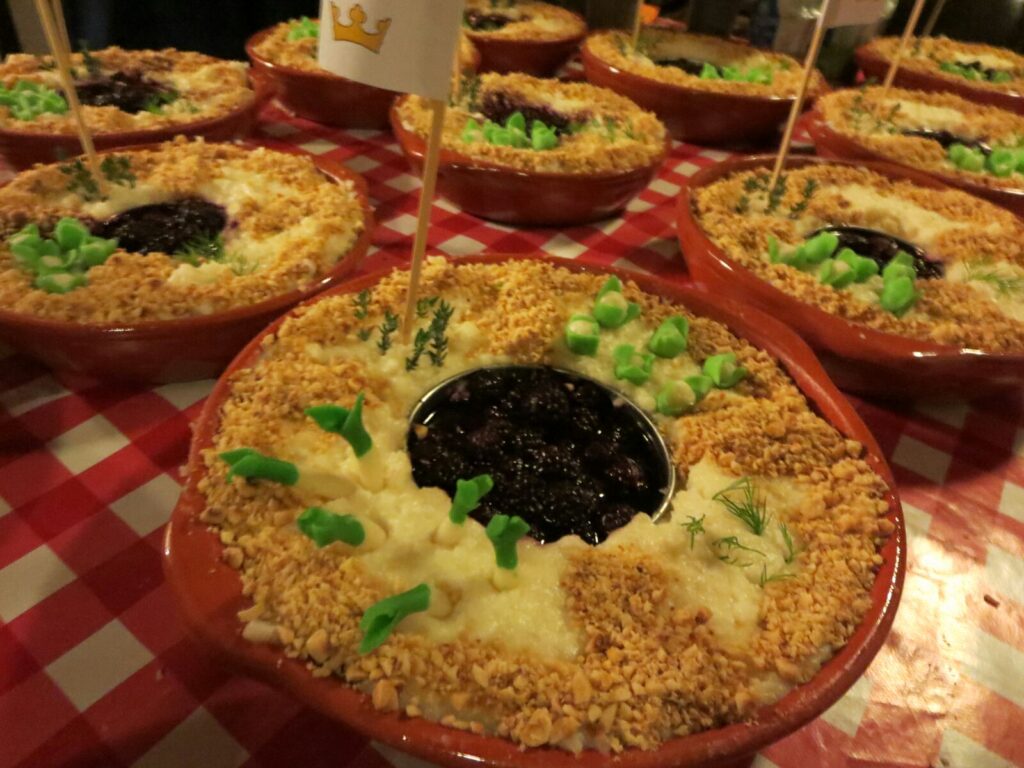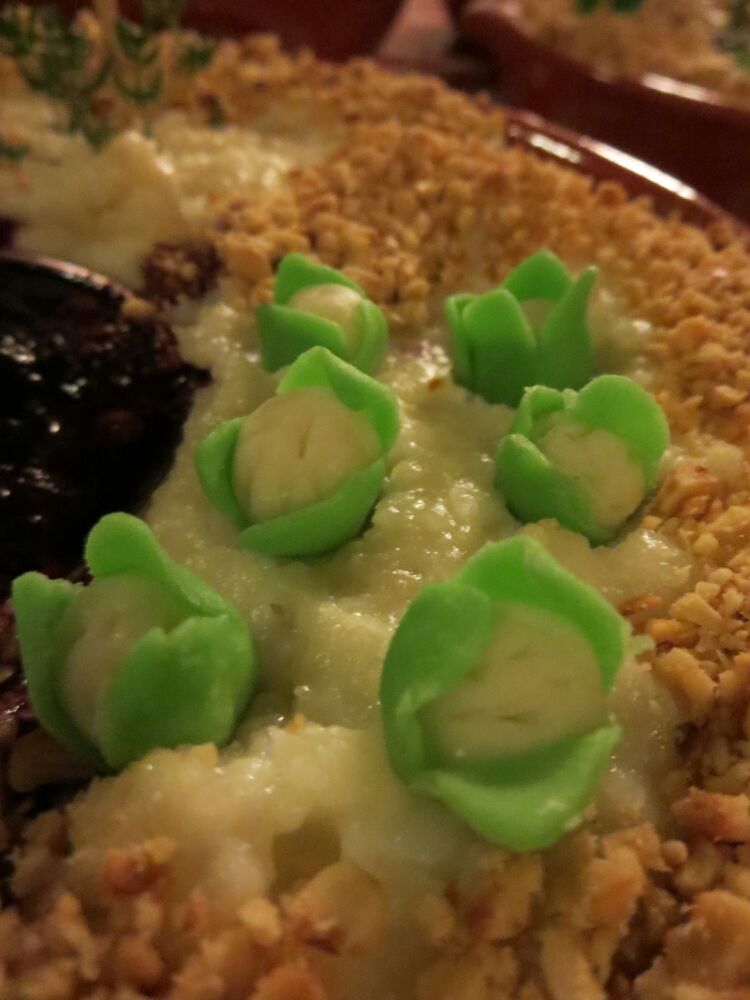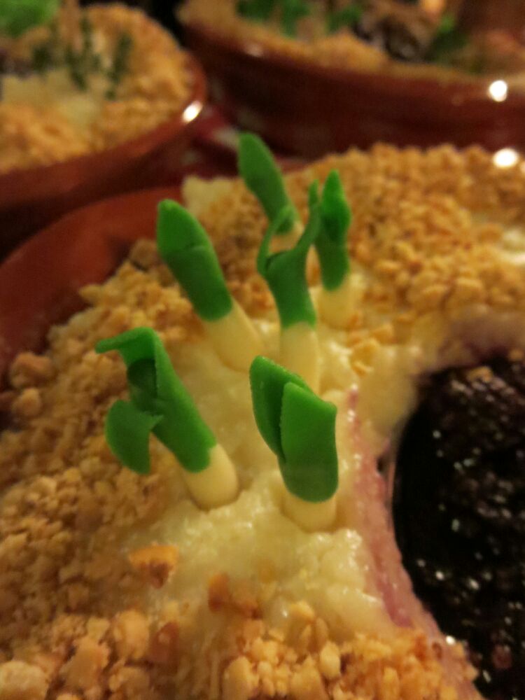 Men sal die anyun scellen ende snijen die in scijven in tween, fruten wel in die olije, mer niet veel olije daer in, ende nemen die korsten van den broot ende fruten die mit den anyun ende nemen wat asijn ende bier ende laten dat sieden met den anyun ende mit dat broot ende doen daer in wat suker ende wat gengebaerpoer ende laten dat te samen sieden totdat bijcans dicke wordt ende stellet dan of.